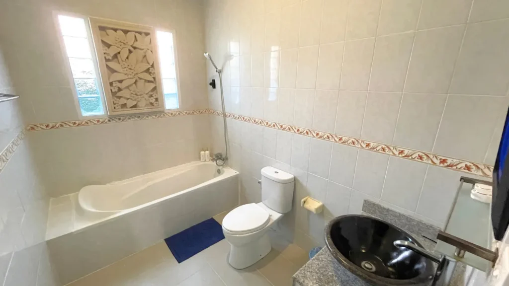 The villa includes three bedrooms and two bathrooms.