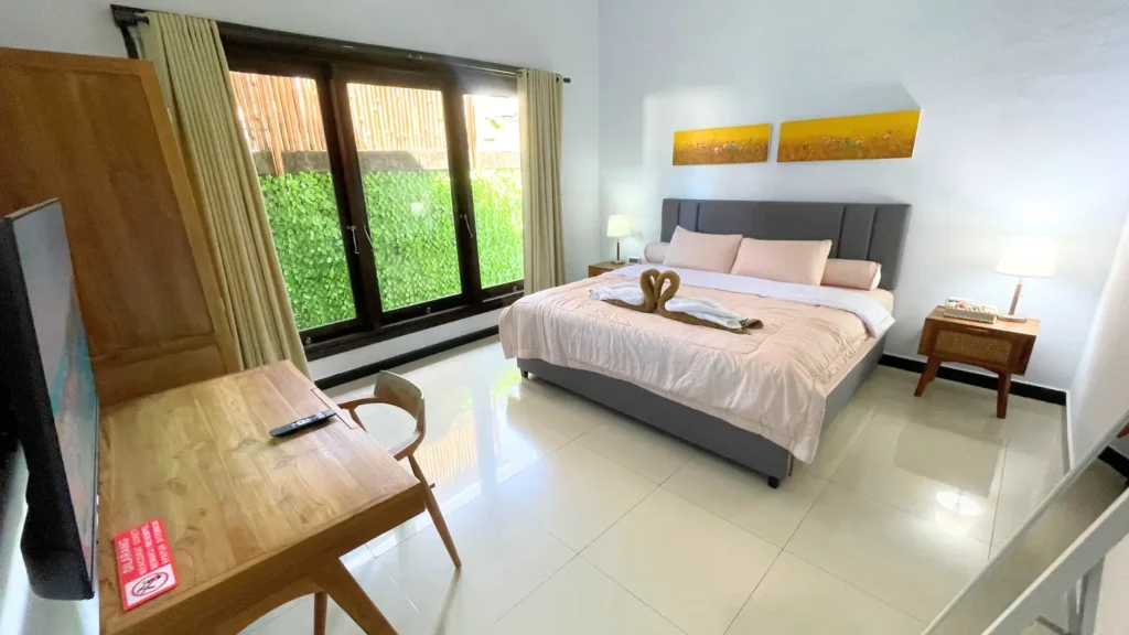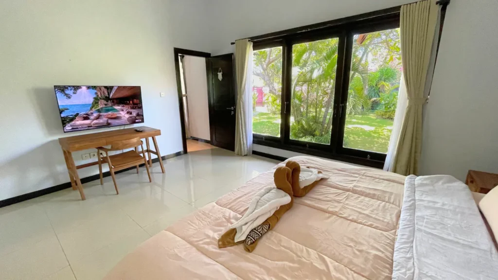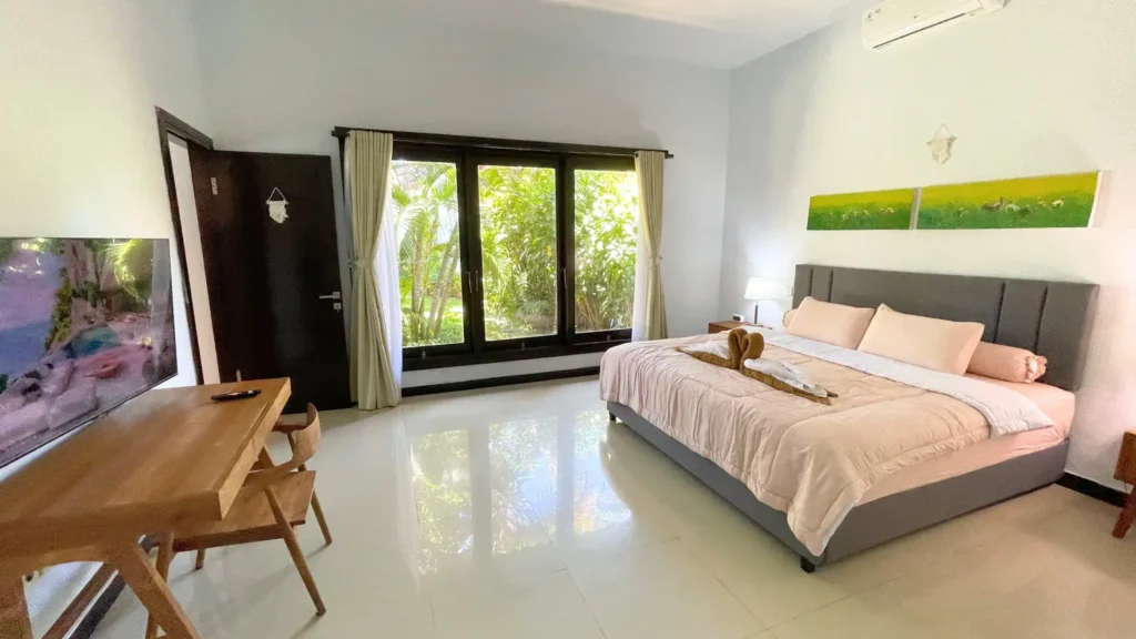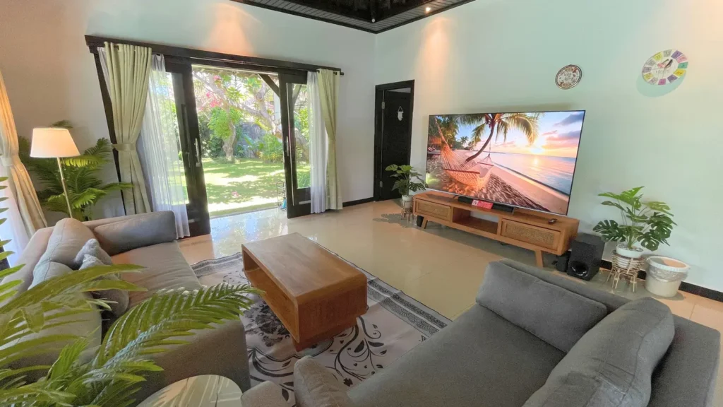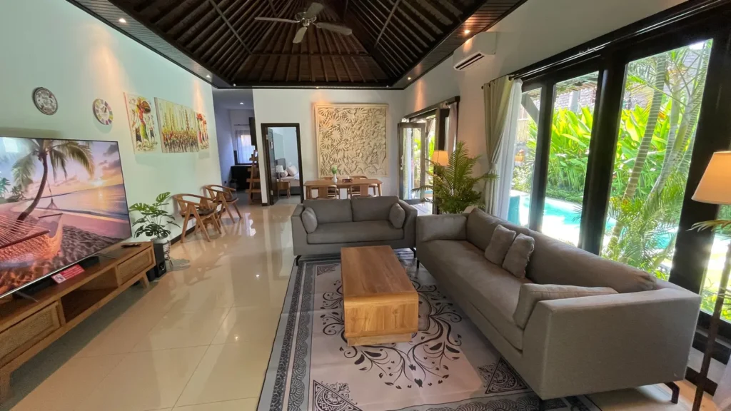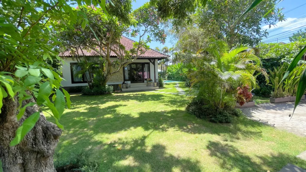 Situated in a quiet residential area near Sanur Beach, the villa is available for daily, weekly, and monthly rental.
