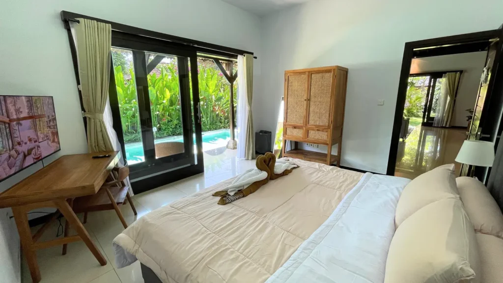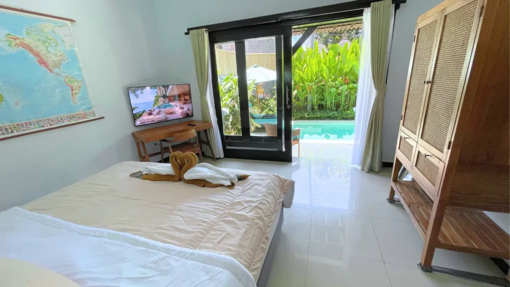 One bedroom provides direct access to the pool area.